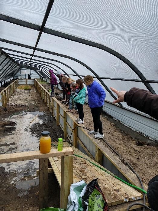 Mud, rain, wind, and cold couldn’t stop the kids of the Way-Out-West 4-H club from visiting our new geothermal heated greenhouse on Sunday, March 14th. As you can see, we even had flooding in the greenhouse from all the rain! Once the outside dirtwork is finished flooding won’t be such an issue. The kids learned